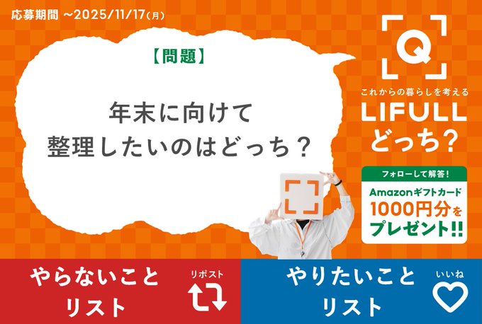 【X懸賞】Amazonギフト券1,000円分を10名様にプレゼント 2025.11.16LIFULL‐プレゼントキャンペーン 賞品:Amazonギフト券1,000円分(10名様) 締切:2025年11月17日(月)① @LIFULL_Corp をフォロー ② RP or いいねで回答を選択※詳細はキャンペーンページにてご確認ください。応募はこちらから