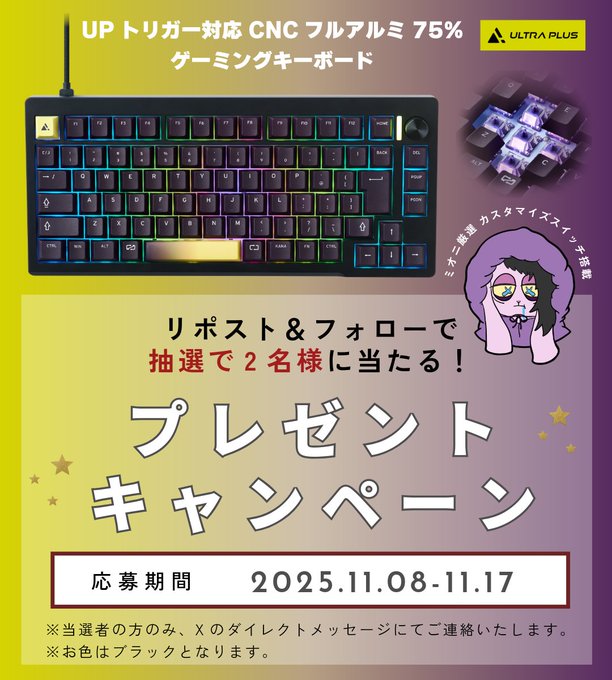 賞品:ゲーミングキーボード「UP-MKGA75MTL-RTシリーズ」(2名様)