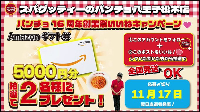 【X懸賞】Amazonギフト券5,000円分を2名様にプレゼント 2025.11.16スパゲッティーのパンチョ八王子松木店‐プレゼントキャンペーン 賞品:Amazonギフト券5,000円分(2名様) 締切:2025年11月17日(月)参加方法☑@pancho_matsuki をフォロー☑ポストをいいね※詳細はキャンペーンページにてご確認ください。応募はこちらから