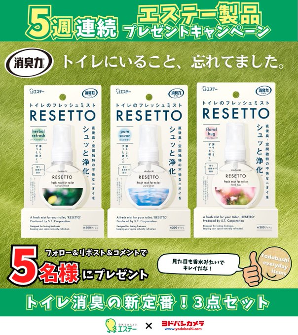 【X懸賞】消臭力 トイレのフレッシュミスト「RESETTO」3つの香りを5名様にプレゼント 2025.11.16ヨドバシ@日用品専門‐プレゼントキャンペーン 賞品:消臭力 トイレのフレッシュミスト「RESETTO」3つの香り(5名様) 締切:2025年11月18日(火)👉フォロー&リポスト👉消臭力、使っていますか?※詳細はキャンペーンページにてご確認ください。応募はこちらから