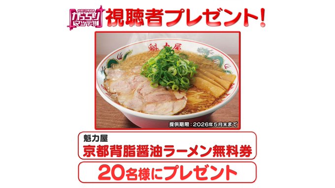 賞品:京都背脂醤油ラーメン無料券(20名様)