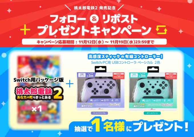 賞品:Switch用『桃太郎電鉄2 ~あなたの町も きっとある~ 東日本編+西日本編』×1&USBコントローラベーシカル ×2色(1名様)