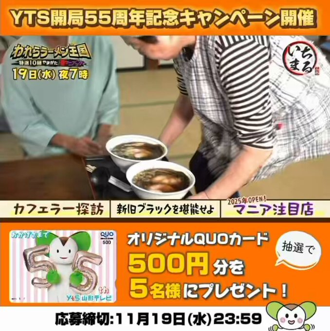 【X懸賞】オリジナルQUOカード500円分を5名様にプレゼント 2025.11.17山形テレビ‐開局55周年記念キャンペーン 賞品:オリジナルQUOカード(5名様) 締切:2025年11月19日(水)公式X(Twitter)アカウントをフォロー&キャンペーン対象ポストをリポストしてご応募ください。※詳細はキャンペーンページにてご確認ください。応募はこちらから