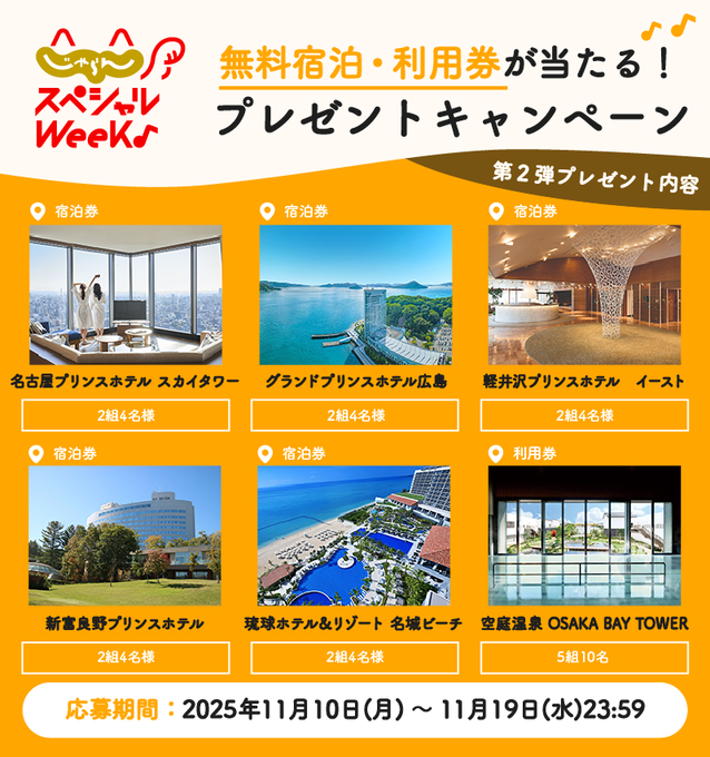 【X懸賞】無料宿泊券、利用券を15組様にプレゼント 2025.11.17#じゃらんスペシャルウィーク 開催記念 賞品:無料宿泊券・利用券(15組様) 締切:2025年11月19日(水)公式X(Twitter)アカウントをフォロー&キャンペーン対象ポストをリポストしてご応募ください。※詳細はキャンペーンページにてご確認ください。応募はこちらから