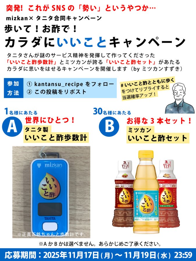 賞品:いいこと酢歩数計、いいこと酢セット(合計31名様)
