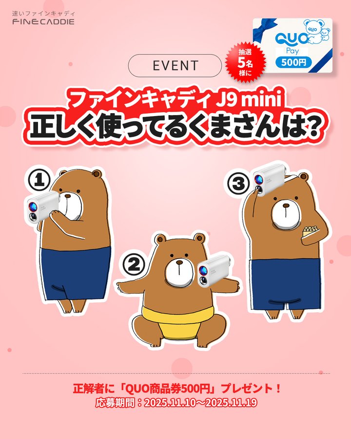 【X懸賞】QUOカードPay500円分を5名様にプレゼント 2025.11.18 2025.11.17FineCaddie/FineVu_JP‐ファインキャディJ9 miniを正しく使ってるくまさんはどれ? 賞品:QUOカードPay500円分(5名様) 締切:2025年11月19日(水)リポスト&コメントで答えてね💬※詳細はキャンペーンページにてご確認ください。応募はこちらから