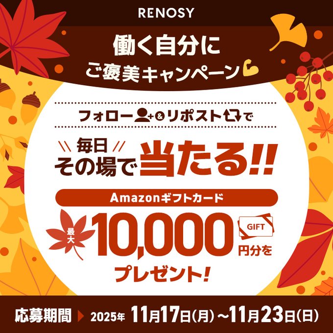 RENOSY公式X(Twitter)アカウントをフォロー&キャンペーン対象ポストをリポストしてご応募ください。