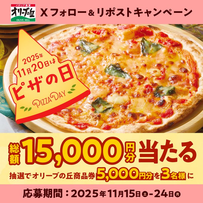 イタリア食堂 オリーブの丘公式X(Twitter)アカウントをフォロー&キャンペーン対象ポストをリポストしてご応募ください。
