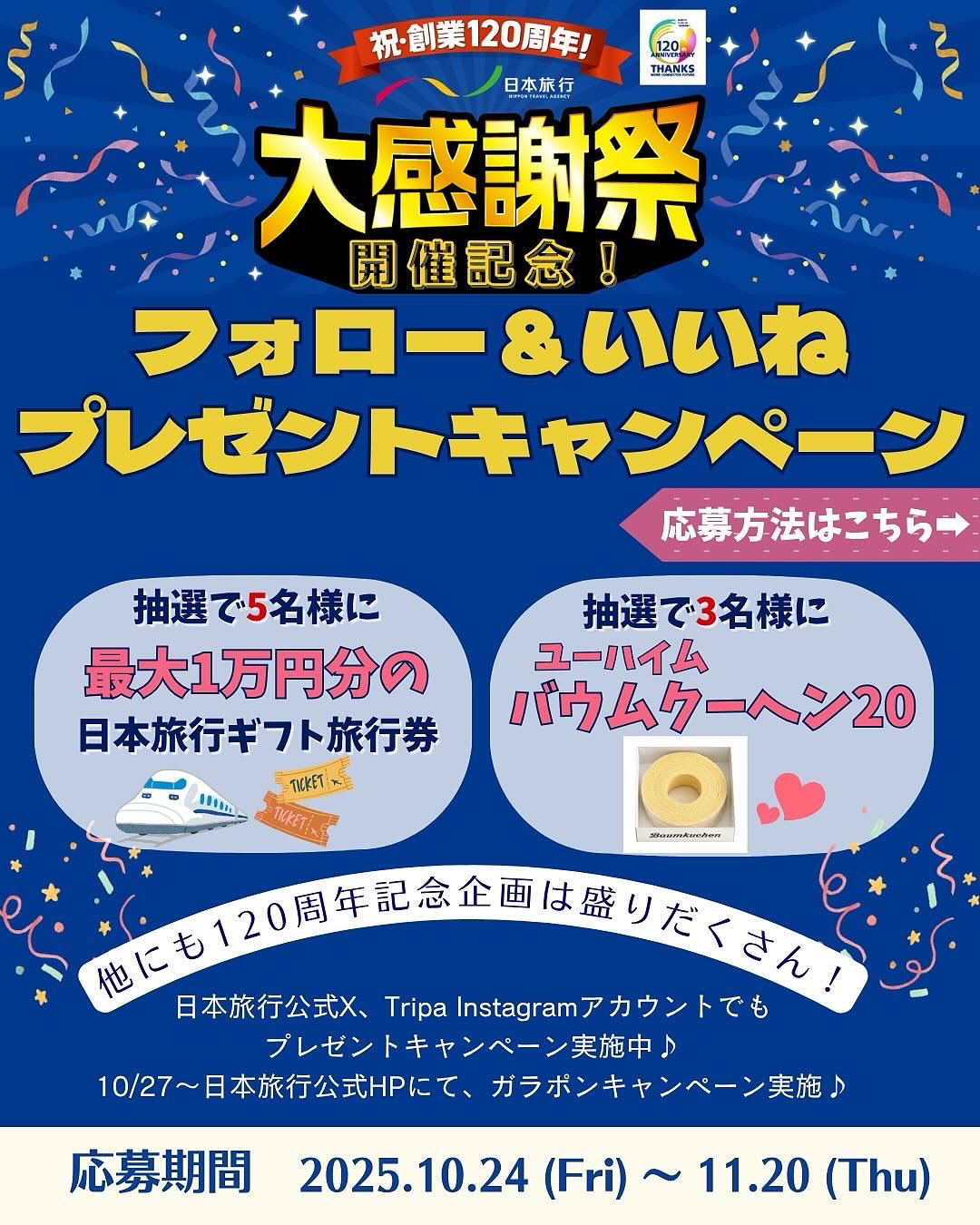 日本旅行‐「祝・創業120周年!日本旅行大感謝祭」開催記念!フォロー&いいねキャンペーン