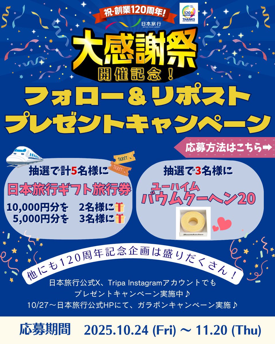 賞品:日本旅行ギフト旅行券、ユーハイム バームクーヘン20(合計8名様)