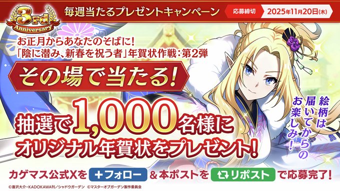 『陰の実力者になりたくて!マスターオブガーデン』公式X(Twitter)アカウントをフォロー&キャンペーン対象ポストをリポストして、記載されているURLからご応募ください。