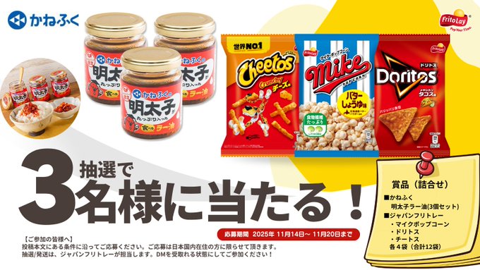 @Fritolay_JP @Mentai_Kanefuku をフォロー&キャンペーン対象ポストをリポストしてご応募ください。