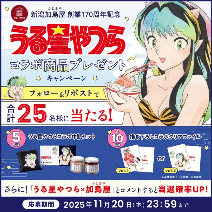 【X懸賞】うる星やつらコラボ商品を25名様にプレゼント 2025.11.19新潟 加島屋 創業170周年記念 賞品:うる星やつらコラボ商品(25名様) 締切:2025年11月20日(木)公式X(Twitter)アカウントをフォロー&キャンペーン対象ポストをリポストしてご応募ください。※詳細はキャンペーンページにてご確認ください。応募はこちらから