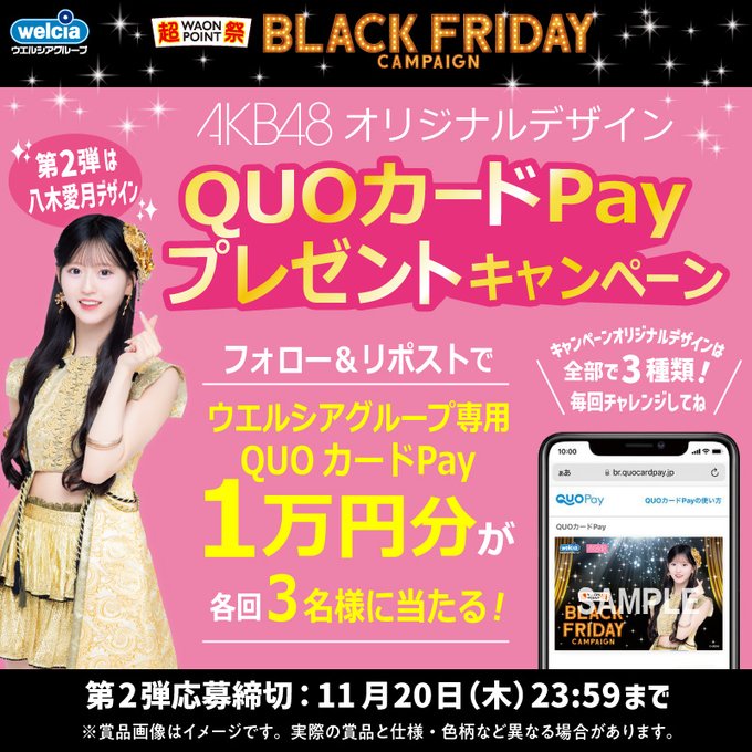 賞品:AKB48オリジナルデザインウエルシアグループ専用QUOカードPay10,000円分(3名様)