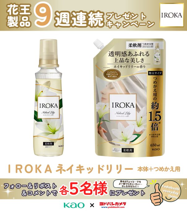 【X懸賞】IROKA ネイキッドリリー 本体+つめかえ用を5名様にプレゼント 2025.11.19ヨドバシ@日用品専門‐プレゼントキャンペーン 賞品:IROKA ネイキッドリリー 本体+つめかえ用(5名様) 締切:2025年11月20日(木)👉フォロー&リポスト👉柔軟剤に求める要素はなんですか?✍️※詳細はキャンペーンページにてご確認ください。応募はこちらから
