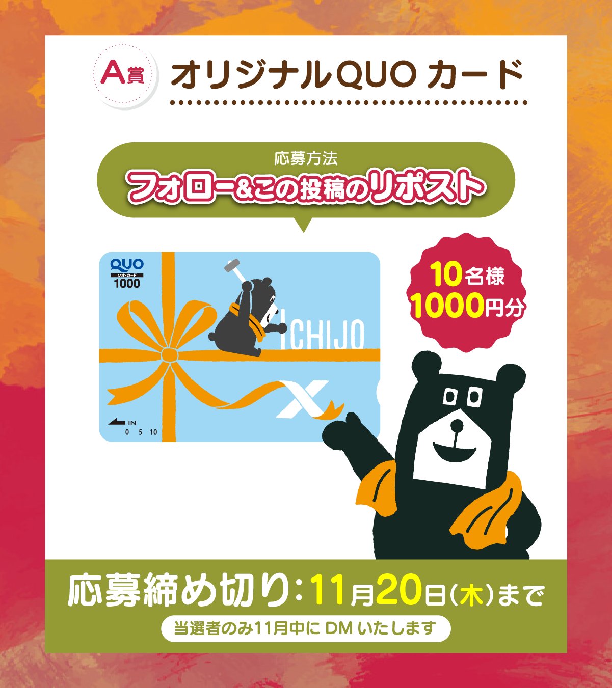 フォロー&リポストや、食欲の秋につい食べ過ぎてしまったものを投稿して、「ジョーくんオリジナルQUOカード」や、「ジョーくんのぬいぐるみ」を当てよう!