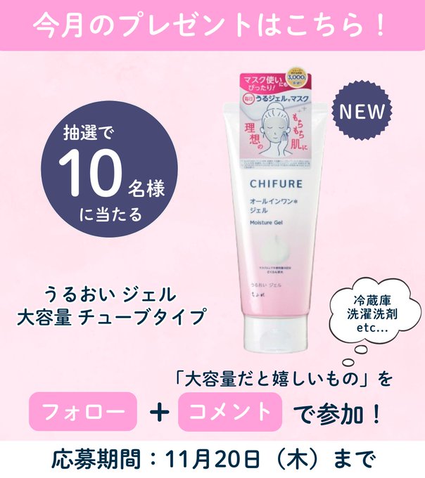 【X懸賞】うるおい ジェル 大容量 チューブタイプを10名様にプレゼント 2025.11.19ちふれ‐ありがとうキャンペーン 賞品:うるおい ジェル 大容量 チューブタイプ(10名様) 締切:2025年11月20日(木)【あなたが「大容量」だと嬉しいもの】をコメントで教えてね♪※詳細はキャンペーンページにてご確認ください。応募はこちらから