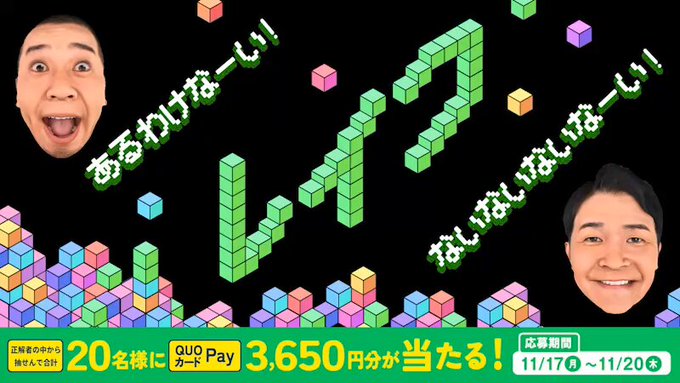 【X懸賞】QUOカードPay3,650円分を20名様にプレゼント 2025.11.19#レイクの変わったものを探せ キャンペーン 賞品:QUOカードPay3,650円分(20名様) 締切:2025年11月20日(木)正解した人の中から抽せんでQUOカードPay 3,650円分が20名様に当たる!※詳細はキャンペーンページにてご確認ください。応募はこちらから