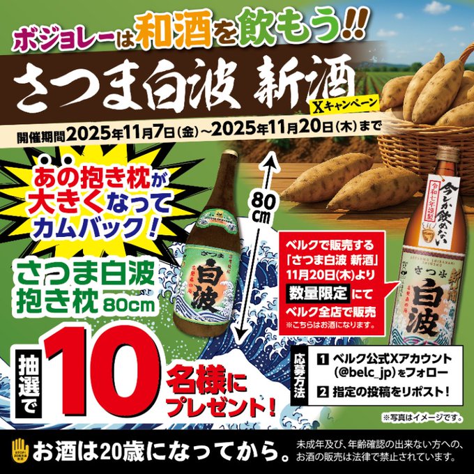 【X懸賞】さつま白波抱き枕80cmを10名様にプレゼント 2025.11.19ベルク‐フォロー&リポストキャンペーン 賞品:さつま白波抱き枕(10名様) 締切:2025年11月20日(木)公式X(Twitter)アカウントをフォロー&キャンペーン対象ポストをリポストしてご応募ください。※詳細はキャンペーンページにてご確認ください。応募はこちらから