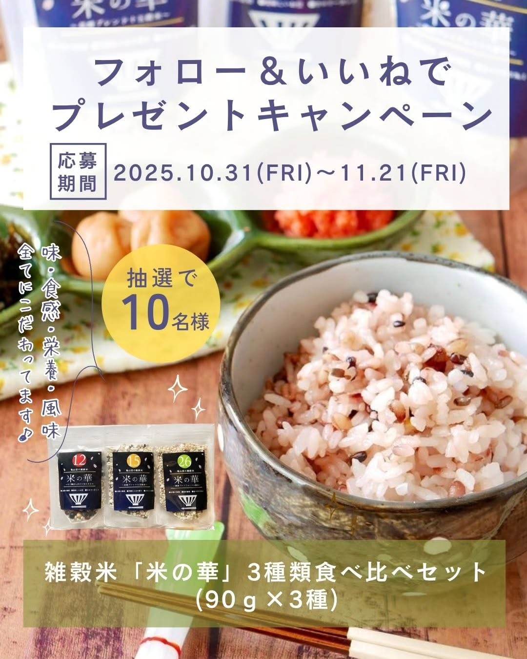 【Instagram懸賞】雑穀米「米の華」を10名様にプレゼント 2025.11.20健やか総本舗亀山堂‐フォロー&いいねキャンペーン 賞品:雑穀米「米の華」(10名様) 締切:2025年11月21日(金)応募方法: 1. 公式Instagramアカウントをフォロー 2. 対象の投稿に「いいね!」※詳細はキャンペーンページにてご確認ください。応募はこちらから