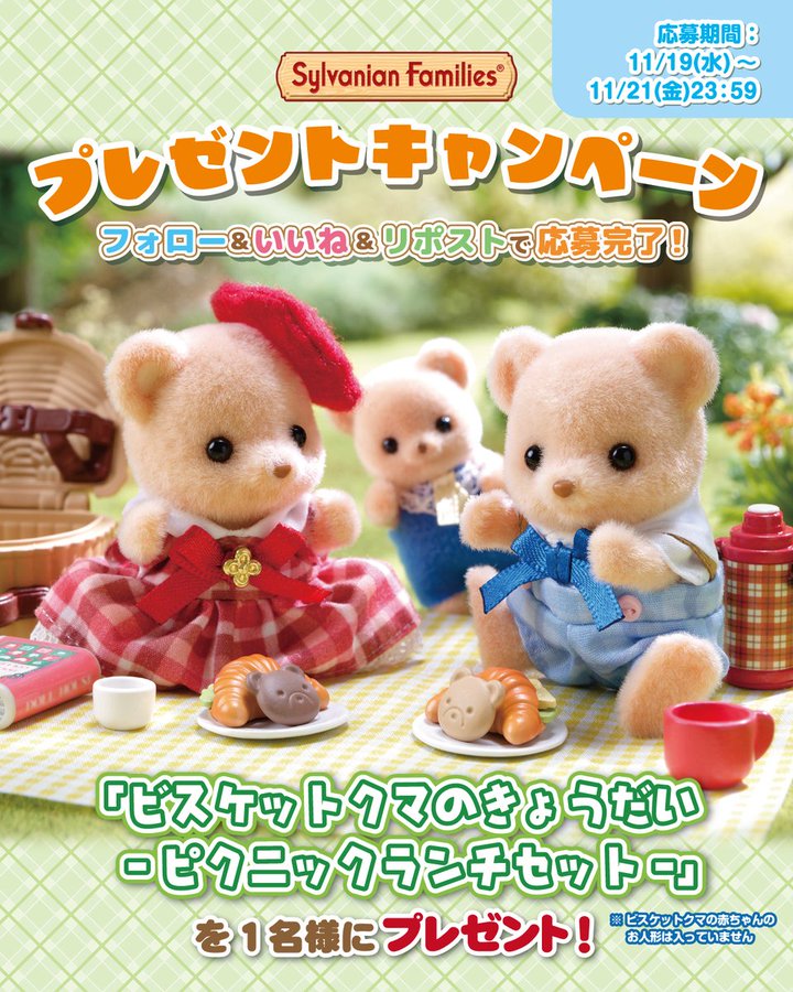 【X懸賞】「ビスケットクマのきょうだい -ピクニックランチセット-」を1名様にプレゼント 2025.11.20シルバニアファミリー‐プレゼントキャンペーン 賞品:「ビスケットクマのきょうだい -ピクニックランチセット-」(1名様) 締切:2025年11月21日(金)アカウントをフォロー&いいね&リポストで応募完了♪※詳細はキャンペーンページにてご確認ください。応募はこちらから