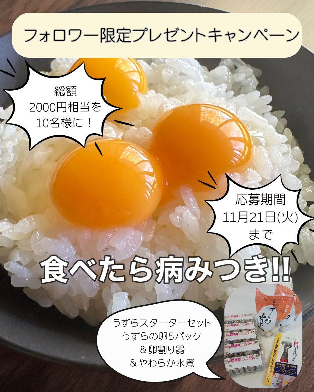 【X懸賞】うずらのたまごスターターキットを10名様にプレゼント 2025.11.20UZULAB‐プレゼントキャンペーン 賞品:うずらのたまごスターターキット(10名様) 締切:2025年11月21日(金)①アカウントをフォロー ②投稿にいいね!※詳細はキャンペーンページにてご確認ください。応募はこちらから
