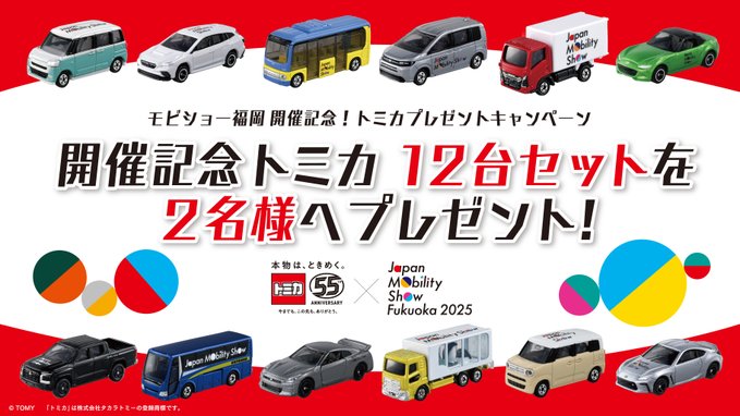 【X懸賞】開催記念トミカ12台セットを2名様にプレゼント 2025.11.20ジャパンモビリティショー福岡2025‐#モビショー福岡 2025 開催記念 賞品:開催記念トミカ12台セット(2名様) 締切:2025年11月21日(金)応募方法: モビショー福岡公式Xをフォロー、 投稿をいいね&RT※詳細はキャンペーンページにてご確認ください。応募はこちらから