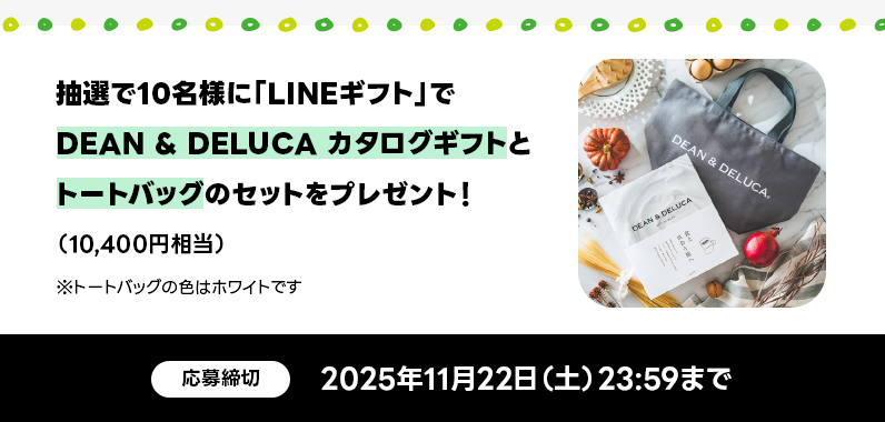 賞品:LINEギフト「DEAN&DELUCAカタログギフト」&「トートバッグ」セット 引換券(10名様)