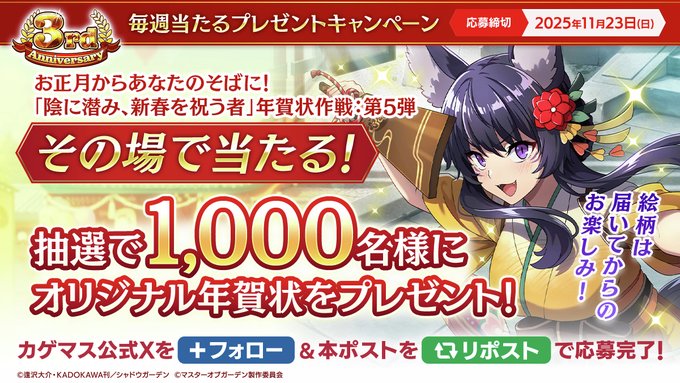 陰の実力者になりたくて!マスターオブガーデン公式X(Twitter)アカウントをフォロー&キャンペーン対象ポストをリポストして、記載されているURLからご応募ください。