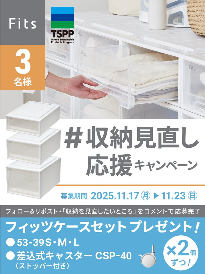 【X懸賞】フィッツケースセットを3名様にプレゼント 2025.11.20天馬株式会社‐#収納見直し応援キャンペーン 賞品:フィッツケースセット(3名様) 締切:2025年11月23日(日)①フォロー&投稿をリポスト ②「収納を見直したいところ」をコメント※詳細はキャンペーンページにてご確認ください。応募はこちらから