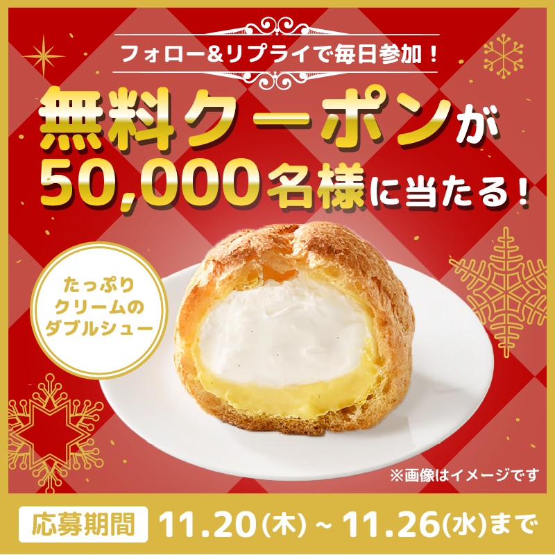 賞品:たっぷりクリームのダブルシュー無料クーポン(50,000名様)