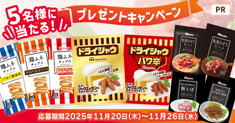 日本ハムのおつまみ9種詰め合わせを5名様にプレゼント 2025.11.21お菓子と、わたし‐読者限定プレゼントキャンペーン 賞品:日本ハムのおつまみ9種詰合せ(5名様) 締切:2025年11月26日(水)アンケートに答えてご応募ください。※詳細はキャンペーンページにてご確認ください。応募はこちらから