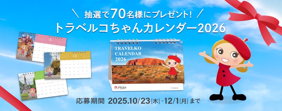 トラベルコちゃんカレンダー2026 卓上タイプを70名様にプレゼント 2025.11.21トラベルコ‐2026年カレンダープレゼントキャンペーン 賞品:トラベルコちゃんカレンダー2026(70名様) 締切:2025年12月1日(月)アンケートに答えてご応募ください。※詳細はキャンペーンページにてご確認ください。応募はこちらから