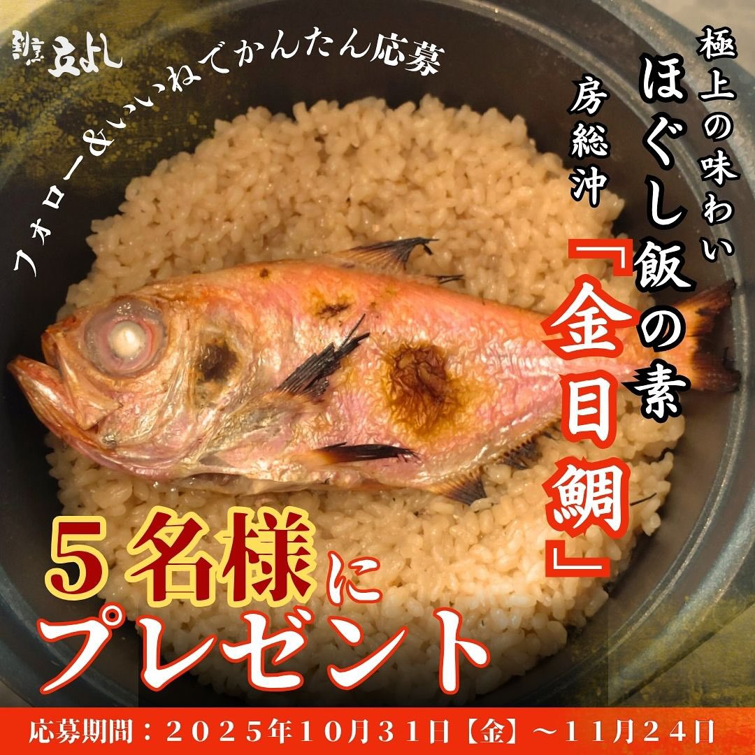 【Instagram懸賞】ほぐし飯の素 金目鯛を5名様にプレゼント 2025.11.21割烹立よし‐プレミアムほぐし飯の素発売記念 賞品:ほぐし飯の素 金目鯛(5名様) 締切:2025年11月24日(月)応募方法: 1. 公式Instagramアカウントをフォロー 2. 対象の投稿に「いいね!」※詳細はキャンペーンページにてご確認ください。応募はこちらから