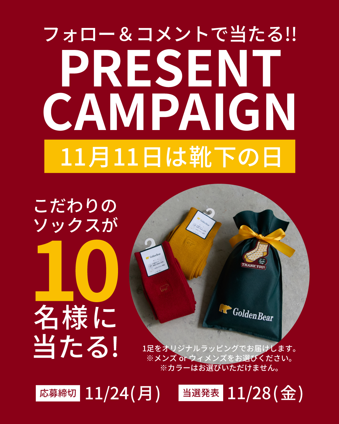 賞品:ゴールデンベアこだわりのソックス(10名様)