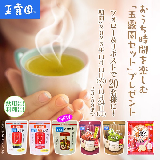 【X懸賞】玉露園セットを20名様にプレゼント 2025.11.21玉露園‐フォロー&リポストキャンペーン 賞品:玉露園セット(20名様) 締切:2025年11月24日(月)公式X(Twitter)アカウントをフォロー&キャンペーン対象ポストをリポストしてご応募ください。※詳細はキャンペーンページにてご確認ください。応募はこちらから