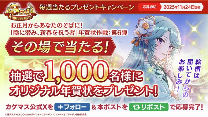 『陰の実力者になりたくて!マスターオブガーデン』公式X(Twitter)アカウントをフォロー&キャンペーン対象ポストをリポストして、記載されているURLからご応募ください。