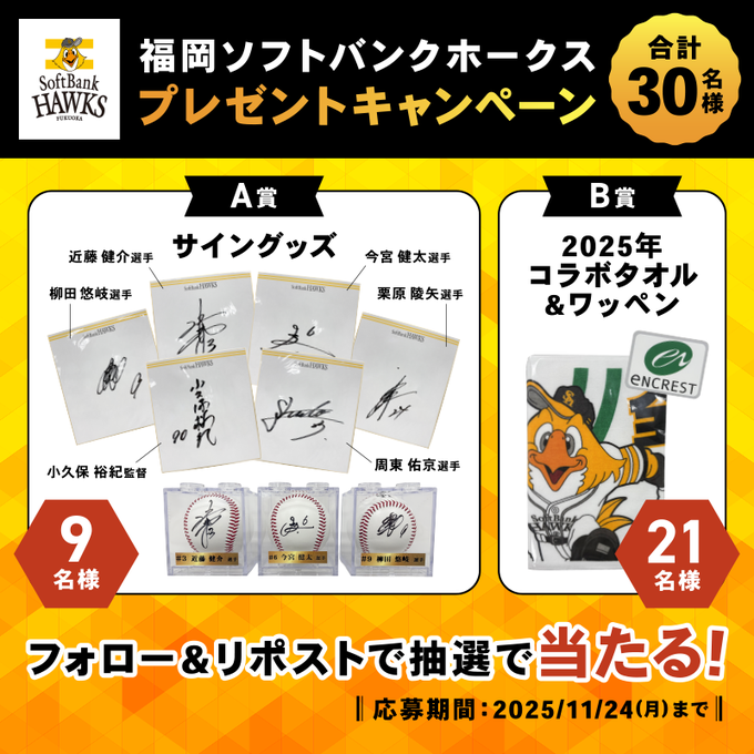 賞品:柳田選手・周東選手の直筆サイングッズ、コラボタオル&ワッペン(合計30名様)