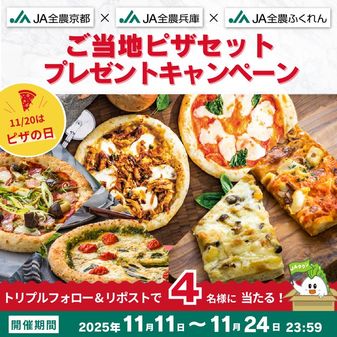 【X懸賞】3県のご当地ピザ食べ比べセットを4名様にプレゼント 2025.11.22 2025.11.21JA全農ふくれん‐プレゼントキャンペーン 賞品:3県のご当地ピザ食べ比べセット(4名様) 締切:2025年11月24日(月)3アカウントをフォロー&キャンペーン対象ポストをリポストしてご応募ください。※詳細はキャンペーンページにてご確認ください。応募はこちらから