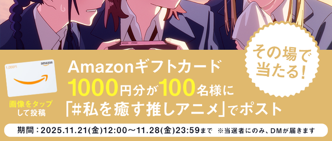 【毎日・X懸賞】Amazonギフトカード1,000円分が100名様にその場で当たる! 2025.11.22dアニメストア‐フォロー&リポストキャンペーン 賞品:Amazonギフトカード1,000円分(100名様) 締切:2025年11月28日(金)みなさんの #私を癒す推しアニメ をぜひ教えてください!※詳細はキャンペーンページにてご確認ください。応募はこちらから