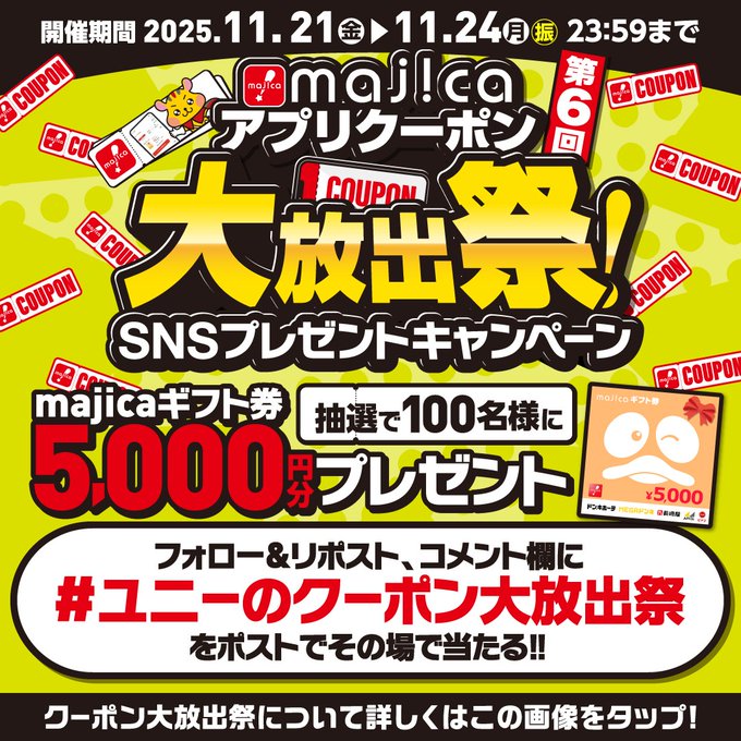 【毎日・X懸賞】majicaギフト券5,000円分が100名様にその場で当たる!