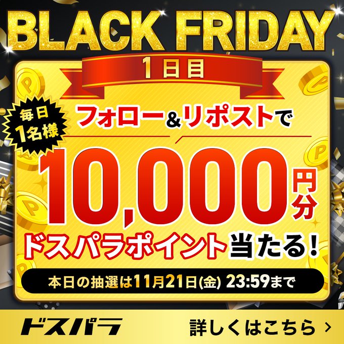 【毎日・X懸賞】ドスパラポイント10,000円分を毎日1名様にプレゼント 2025.11.22ドスパラ‐BLACK FRIDAY フォロー&リポストキャンペーン 賞品:ドスパラポイント10,000円分(毎日1名様)ドスパラ公式X(Twitter)アカウントをフォロー&キャンペーン対象ポストをリポストしてご応募ください。※詳細はキャンペーンページにてご確認ください。応募はこちらから