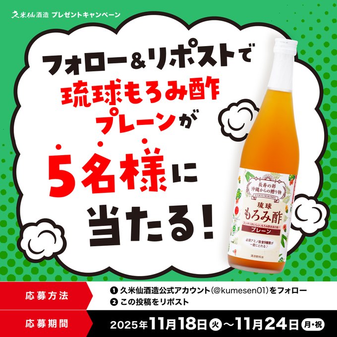【X懸賞】もろみ酢プレーン味を5名様にプレゼント 2025.11.23久米仙酒造‐フォロー&リポストキャンペーン 賞品:もろみ酢プレーン味(5名様) 締切:2025年11月24日(月)公式X(Twitter)アカウントをフォロー&キャンペーン対象ポストをリポストしてご応募ください。※詳細はキャンペーンページにてご確認ください。応募はこちらから