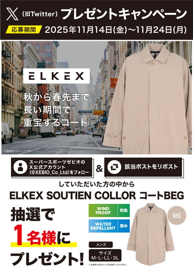 【X懸賞】エルケクス(ELKEX)SOUTIEN COLLAR コートを1名様にプレゼント