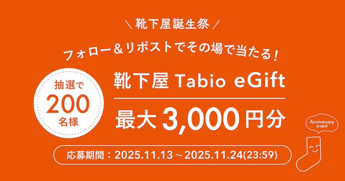 賞品:靴下屋Tabio eGIFT最大3,000円分(200名様)
