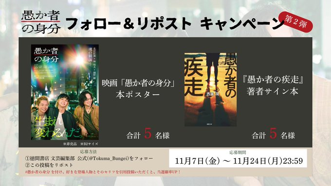 賞品:映画「愚か者の身分」ポスター、「愚か者の疾走」著者サイン本(合計10名様)