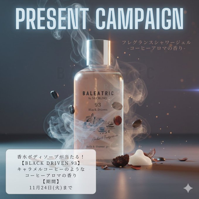【X懸賞】フレグランスシャワージェルをプレゼント 2025.11.23SE:CRUNO‐フォロー&リポストキャンペーン 賞品:フレグランスシャワージェル 締切:2025年11月24日(月)公式X(Twitter)アカウントをフォロー&キャンペーン対象ポストをリポストしてご応募ください。※詳細はキャンペーンページにてご確認ください。応募はこちらから