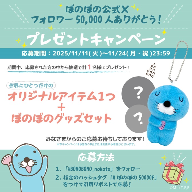 賞品:世界に一つだけのオリジナルアイテム1つ+ぼのぼのグッズセット(1名様)