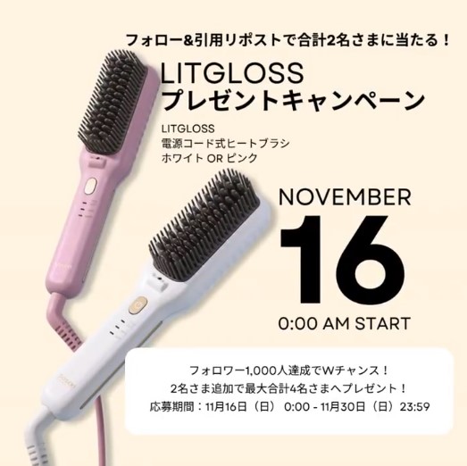 賞品:LITGLOSS 電源コード式ヒートブラシ(2名様)
