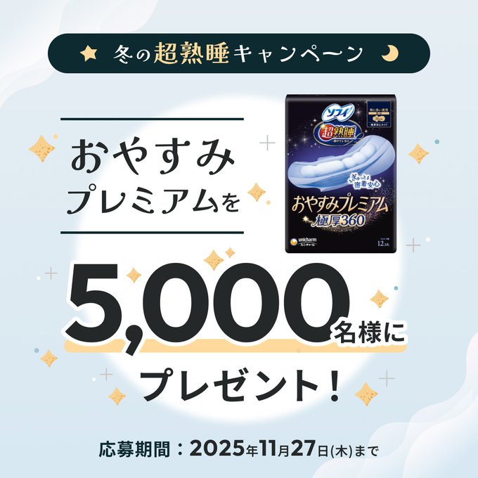 【アプリ】ソフィ超熟睡おやすみプレミアムを5,000名様にプレゼント 2025.11.23ソフィBe限定 冬の超熟睡キャンペーン 賞品:ソフィ超熟睡おやすみプレミアム(5000名様) 締切:2025年11月27日(木)応募条件 ・ソフィBeアプリをインストール ・アプリ内で応募※詳細はキャンペーンページにてご確認ください。応募はこちらから